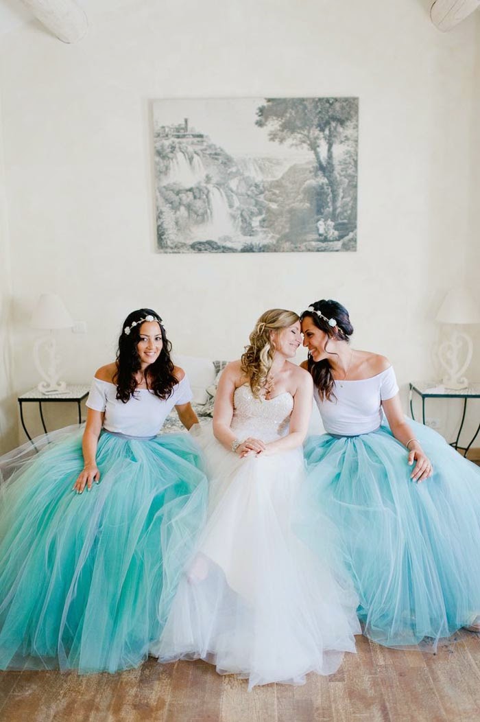 Florence wore our soft Elizabeth getting ready robe, made from cotton lace. She looked so serene while getting her makeup done before slipping into her Reem Acra gown. Her bridesmaids also beamed with delight and looked so pretty in their baby blue tulle bridesmaids skirts! What a fun twist on traditional bridesmaid attire!