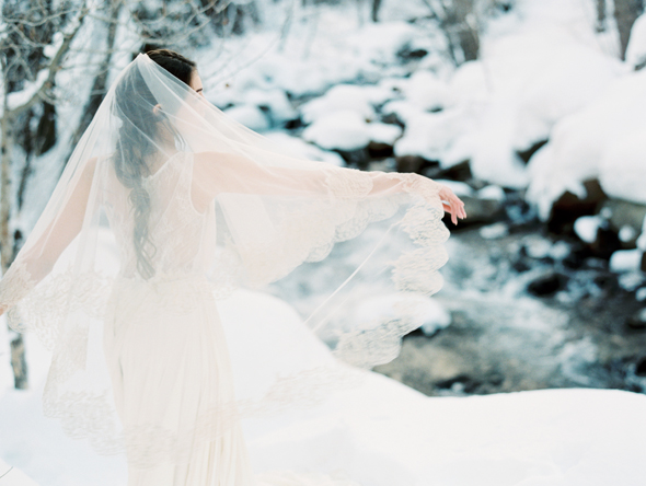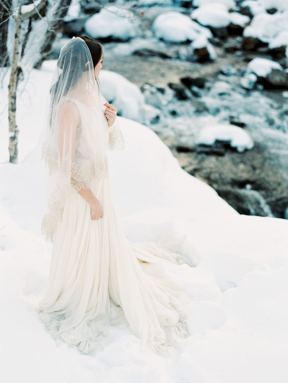Our Gold French lace gilded veil adds a touch of warmth to the bride's ensemble and the muted landscape, while the beautiful drape of this Leanne Marshall gown set the scene for the beautiful bride to drift and dance throughout the magical Winter landscape.